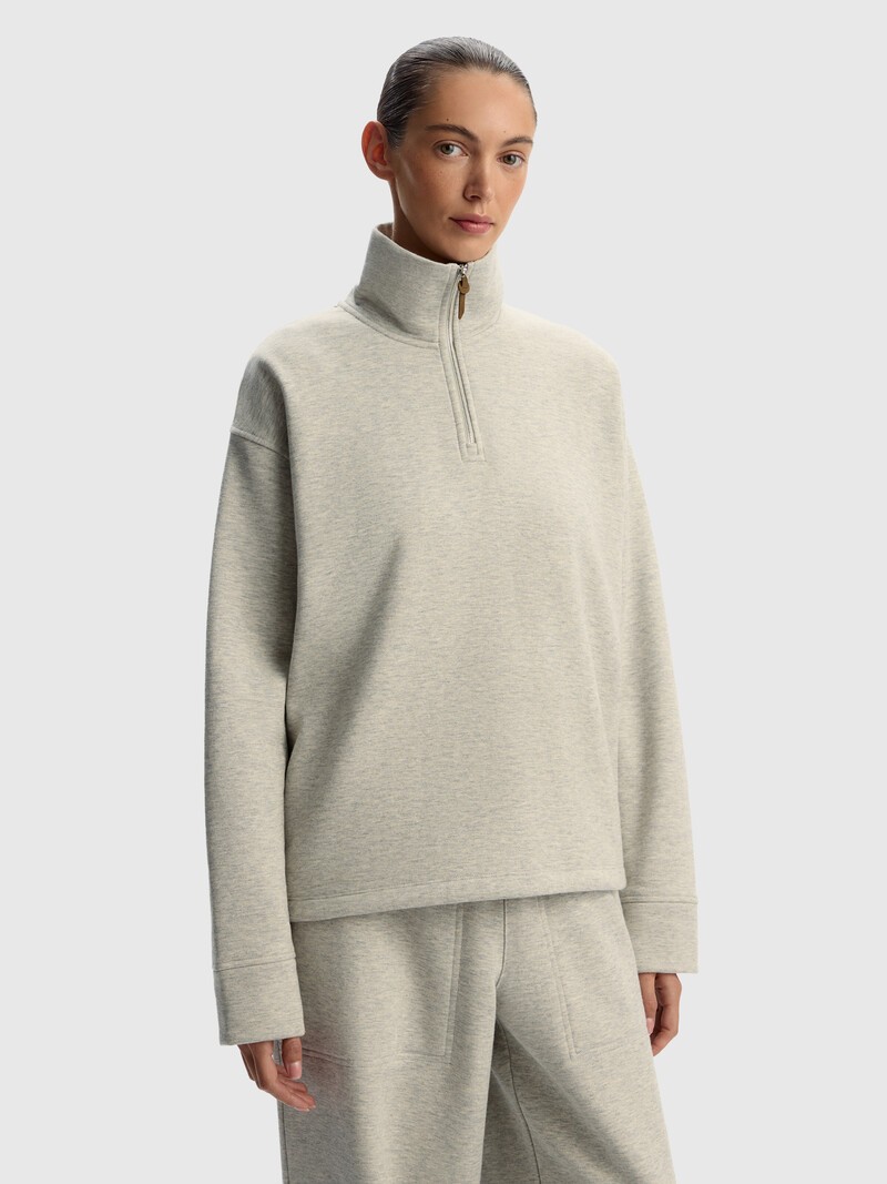 Уютная толстовка оверсайз: спущенное плечо, широкие рукава, кулиска со стопперами из металла. Такую можно носить как верхний слой осенью, а зимой комбинировать с пуховиком или свободным пальто. Выполнена из плотного футера с меланжевой текстурой и легким начесом — мягкого, дышащего и приятного на ощупь. Застегивается на молнию.