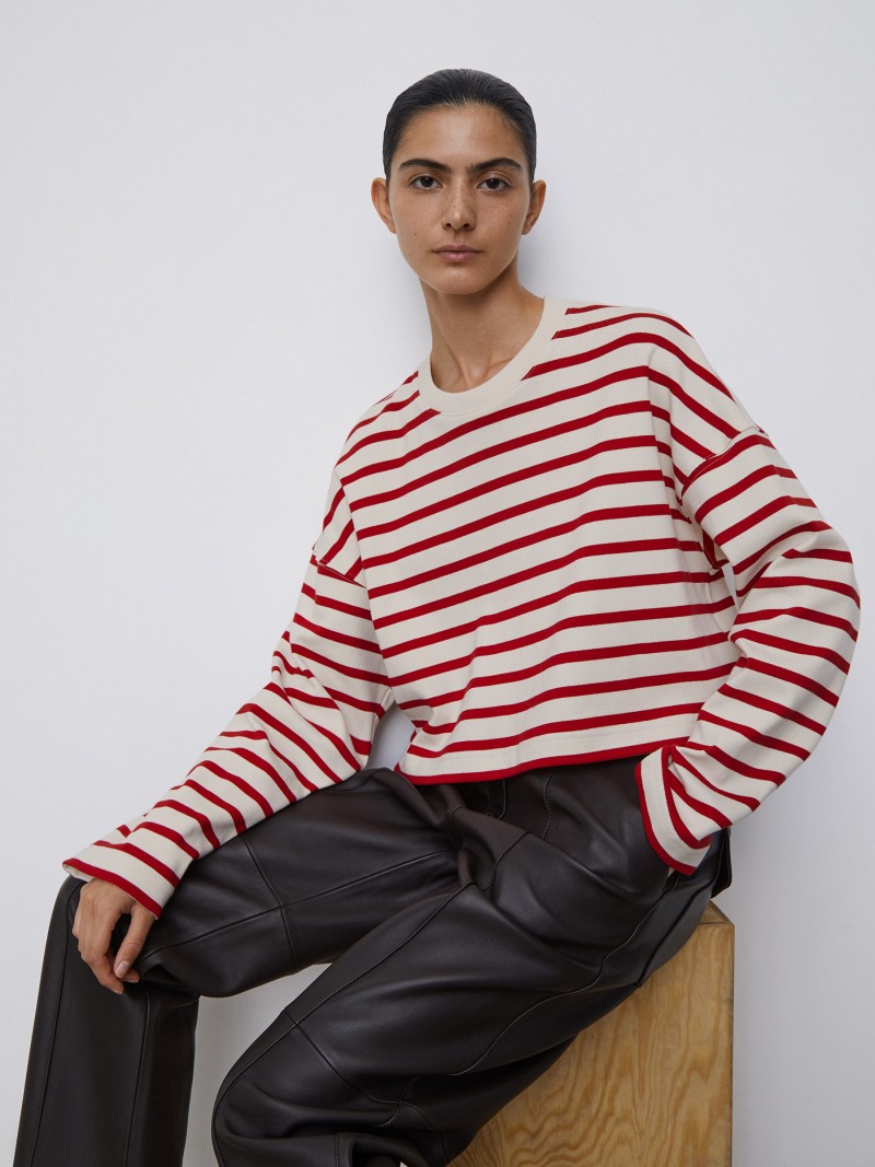 Полоски всегда напоминают о лете, а этот джемпер из плотного хлопка легко перекочует даже в зимний гардероб. Итальянский трикотаж визуально напоминает вязаный, дышит и не перегревает кожу, а силуэт оверсайз и длина до талии — то что надо к актуальным сегодня широким джинсам с высокой посадкой. Сделано в Беларуси.