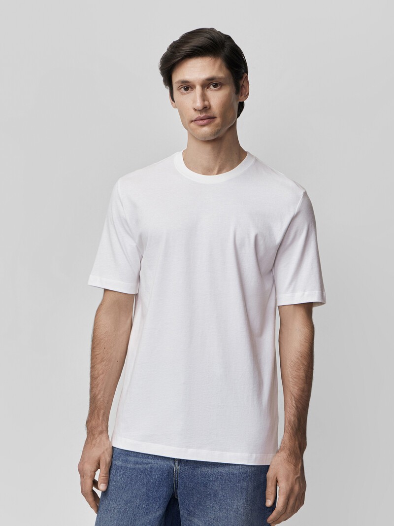 Базовая футболка из мягкого хлопка отлично дышит и отводит влагу. С помощью специальных щеточек трикотажу придали бархатистую, как персик, фактуру. А чтобы футболка служила вам как можно дольше, мы добавили отделку выреза рибаной. Сделано в Турции.