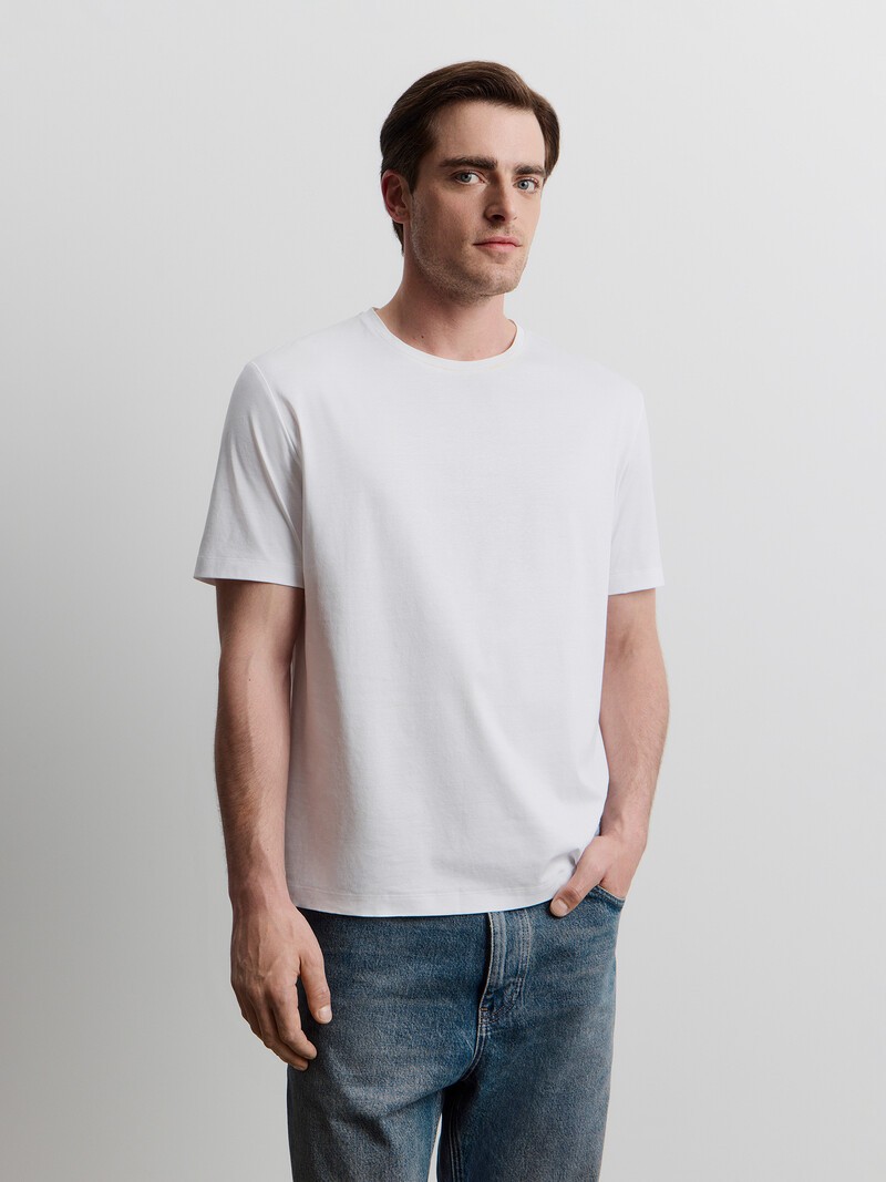 Базовая футболка, созданная из хлопка высшего качества. Эта простая и универсальная модель сшита из пима-хлопка, длинные волокна которого с помощью специальной технологии сделали более прочными, гладкими и стойкими к влиянию времени, стирок и солнца. Благодаря особому переплетению, футболка не перекручивается в швах и сохраняет приятную плотность. Мерсеризованный хлопок — мягкий и гладкий, с шелковистым блеском. Специальная обработка волокон делает материал был более прочным и защищает от выцветания. Сделано в Китае.