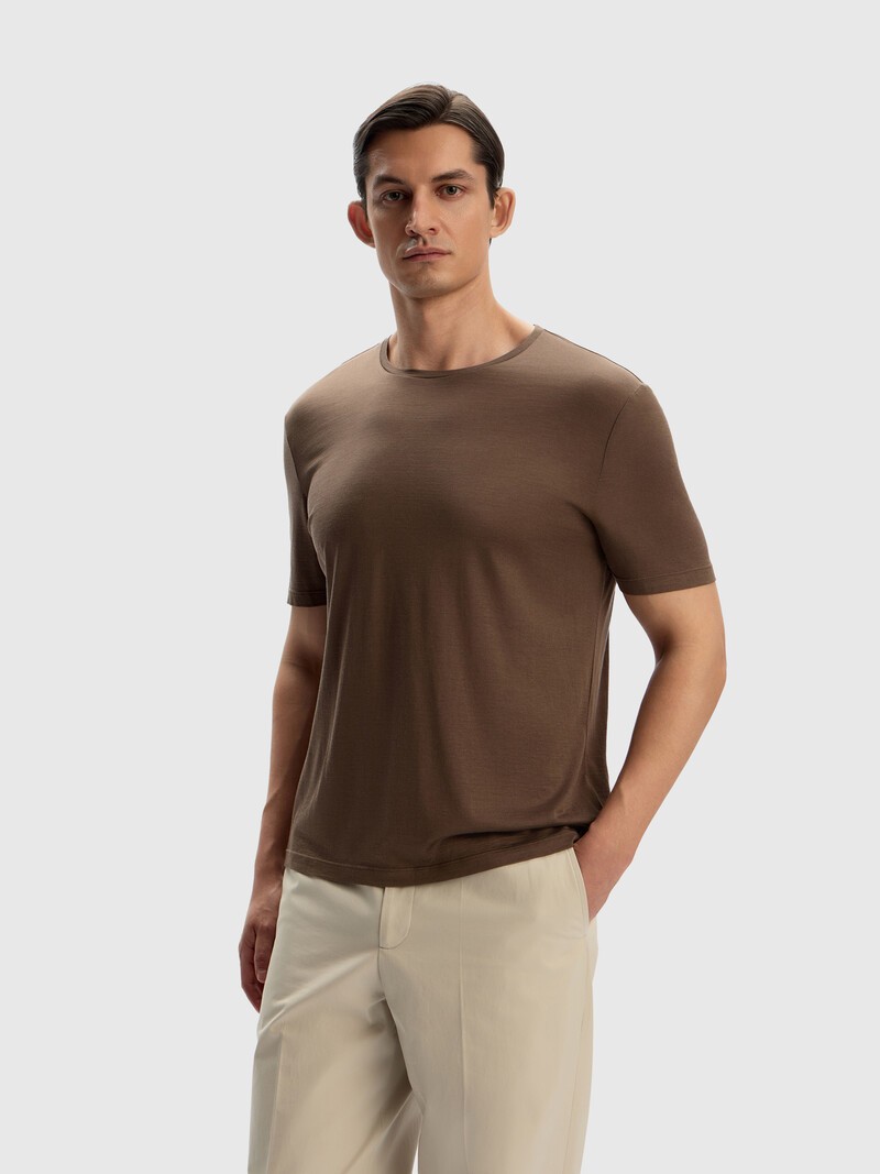 Футболка для жарких дней — комфортная, дышащая и легкая. Пластичный трикотаж из шелка и хлопка приятно охлаждает в жару. Наденьте ее под пиджак или носите самостоятельно — образ получится аккуратным, а благодаря деликатному блеску не будет выглядеть буднично. Сделано в Китае.
