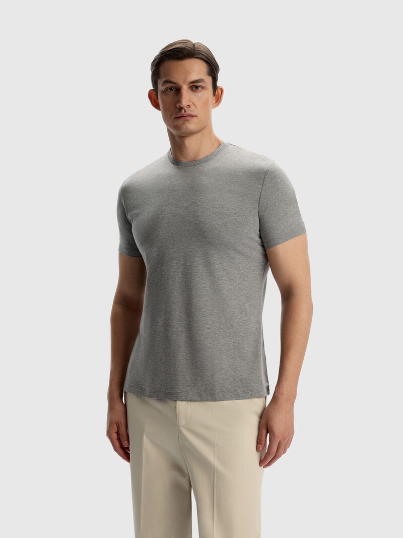 Идеальная базовая футболка — легкая, в меру облегающая и незаметная под одеждой, а значит незаменимая в межсезонье. Выполнена из тонкого мягкого трикотажа на основе хлопка и модала, который дышит, впитывает влагу и не растягивается со временем. У ткани приятная на ощупь шелковистая фактура и цвет, который легко впишется в любой гардероб.