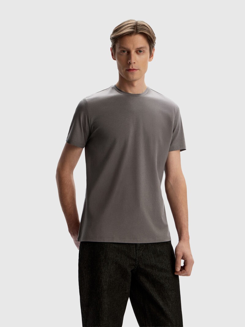 Идеальная базовая футболка — легкая, в меру облегающая и незаметная под одеждой, а значит незаменимая в межсезонье. Выполнена из тонкого мягкого трикотажа на основе хлопка и модала, который дышит, впитывает влагу и не растягивается со временем. У ткани приятная на ощупь шелковистая фактура и цвет, который легко впишется в любой гардероб.