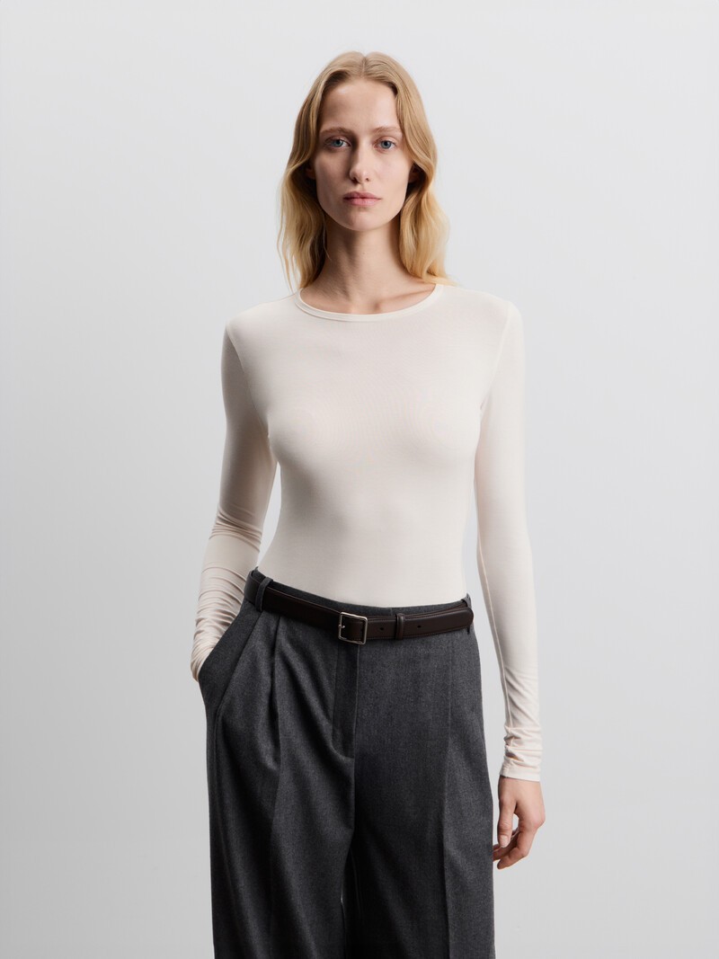 Аккуратный лонгслив из нежного трикотажа с шелком — в этом сезоне мы обновили нашу модель-бестселлер. Лонгслив удобно заправить в брюки и юбку, а благодаря тому, что гладкий и невесомый материал дышит и хорошо впитывает влагу, вам будет комфортно весь день — то, что нужно для первого слоя. Рекомендуем сочетать с бесшовным бельем. Сделано в Китае.