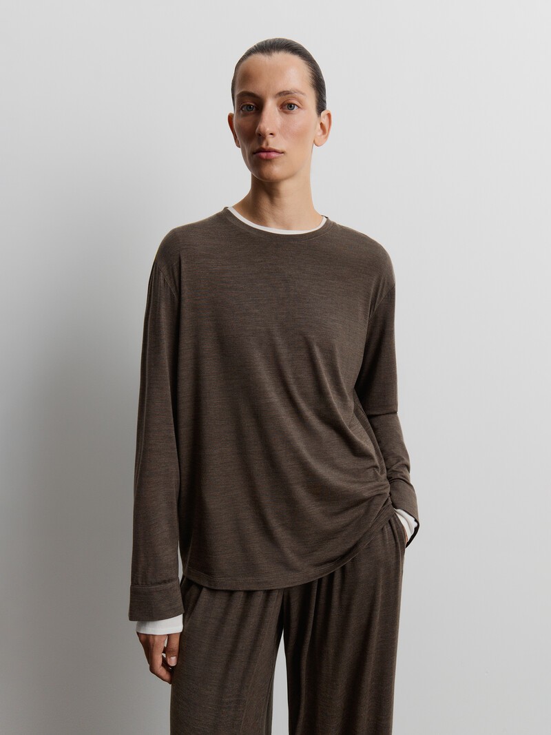 Прямой лонгслив из тонкого трикотажа — для уютных расслабленных образов. Носите его навыпуск или заправив внутрь — приятный на ощупь материал легко драпируется и не создает лишний объем. Такая ткань больше всего похожа на шелк, а чтобы сделать лонгслив более мягким, мы добавили немного шерсти. Лиоцелл — нежное на ощупь волокно из древесины эвкалипта, современная и экологичная альтернатива вискозе. Во время производства не используются токсичные вещества, поэтому вредные выбросы не загрязняют атмосферу. Сделано в Китае.
