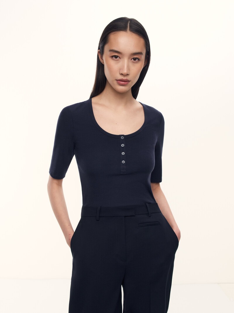 1. Для этой футболки мы нашли новый трикотаж: в нем мягкая шерсть и лиоцелл сочетаются с шелком. Такое изделие будет приятно носить весь теплый сезон 2. Легко вписывается в гардероб и отлично подходит к жакетам: благодаря переплетению в рубчик футболка комфортно облегает, повторяя линии вашей фигуры 3. Застежка на пуговицы из натурального перламутра