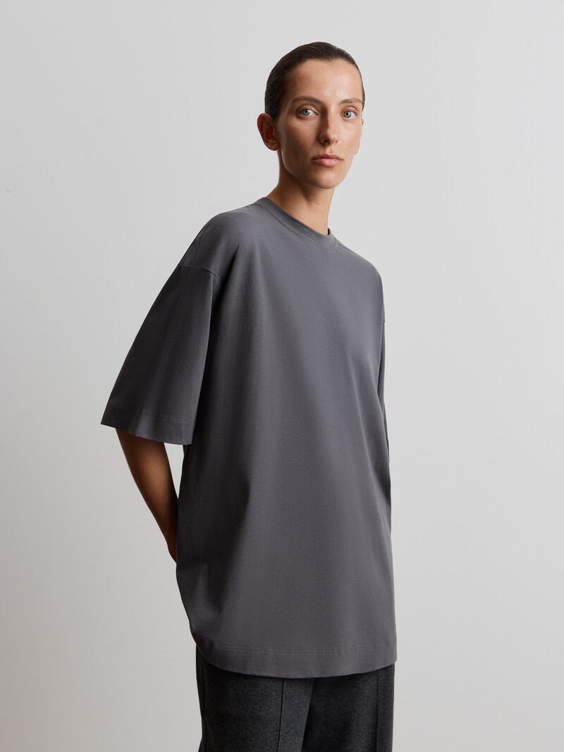 Свободная футболка с широким рукавом — для комфортных и расслабленных образов. Чтобы модель не получилась слишком объемной, мы выбрали 100% хлопок — струящийся, тактильной приятный и прочный. Мягкий и тонкий ворс на поверхности материала создается при обработке специальными щеточками, не повреждающими волокно, и делает цвет чуть приглушенным. Сделано в Китае.