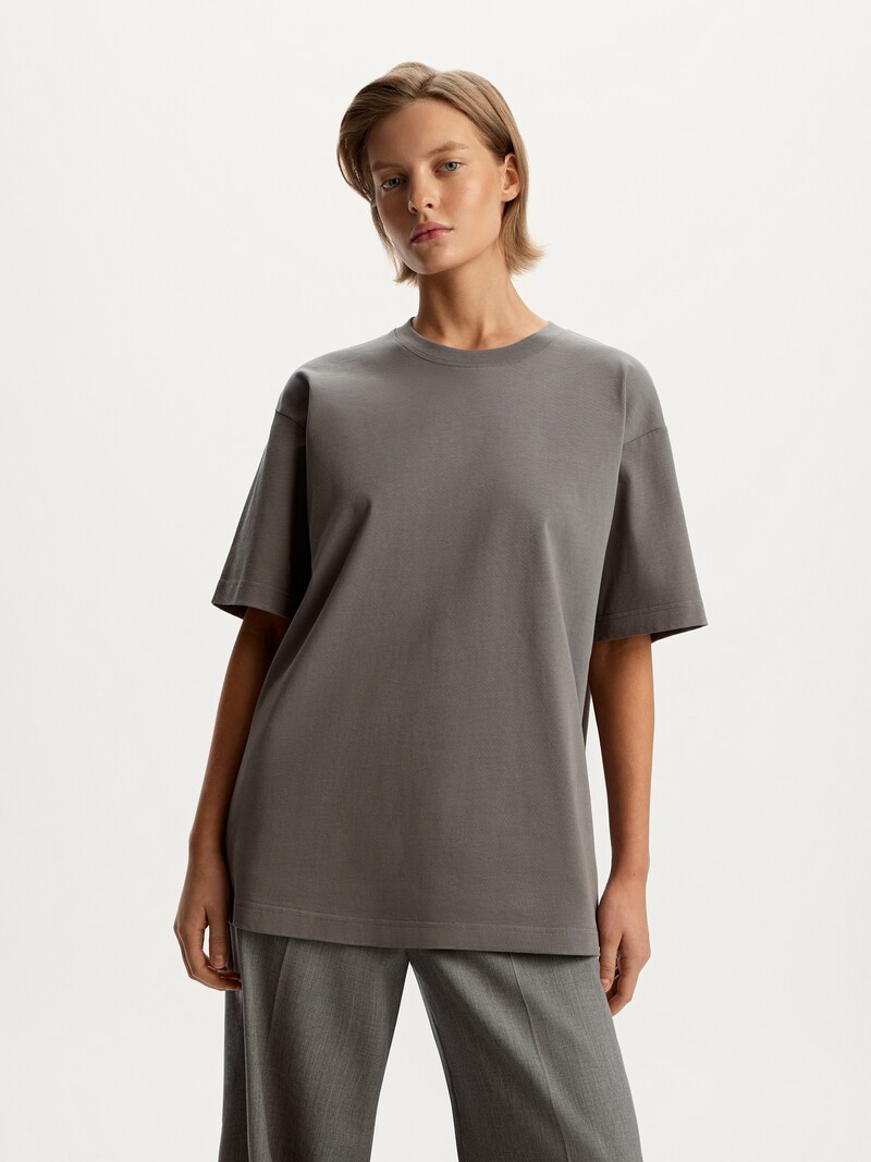 Объемная удлиненная футболка на каждый день. Дополните образ джинсами или спортивными брюками, акцентными аксессуарами или шопером. Мы выбрали для модели плотный и мягкий дышащий хлопок — комфортно будет с утра и до самого вечера. Сделано в Китае.