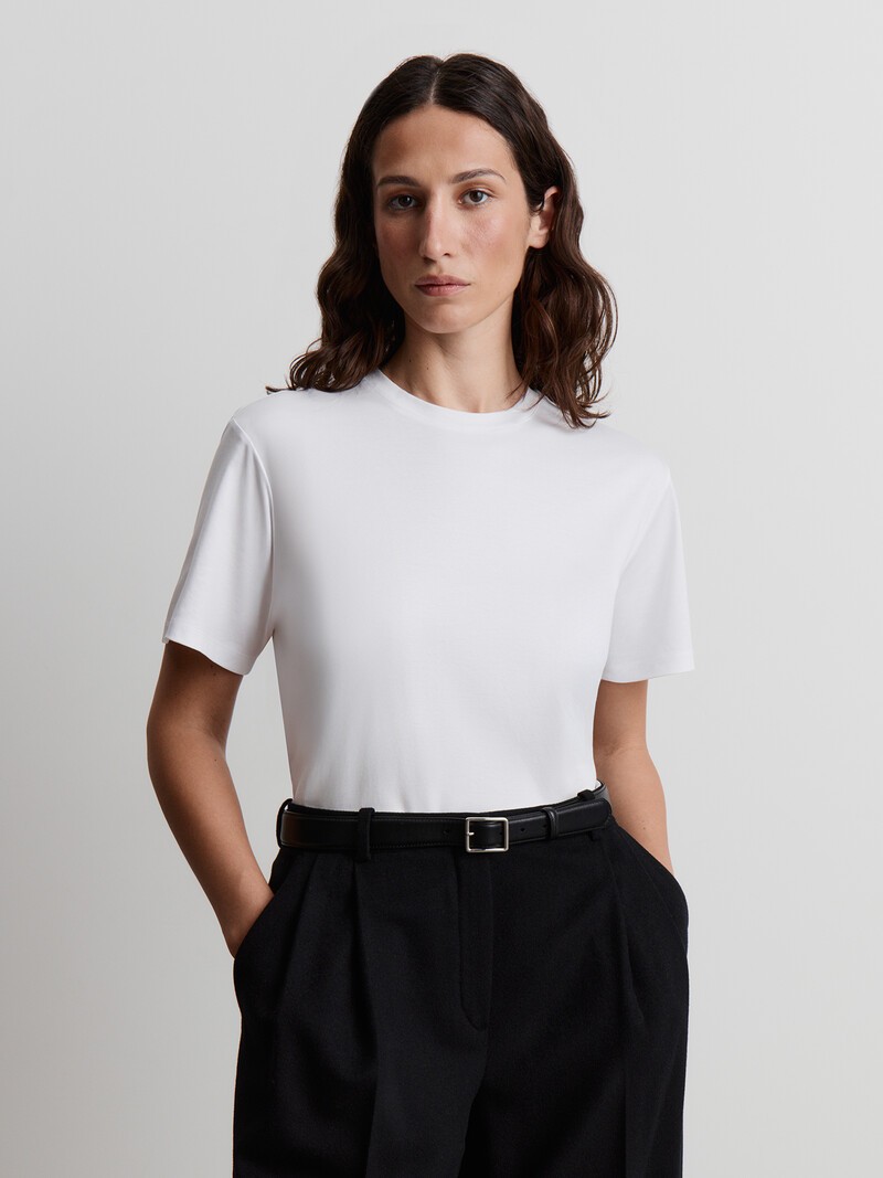 Прямая свободная футболка с коротким рукавом и круглой горловиной, напоминающая мужскую — наш бестселлер. Комфортная и универсальная, она подойдет и к легким юбкам, и к джинсам, и к свободным жакетам. Выполнена из тонкого длинноволокнистого хлопка с двойным переплетением. Мерсеризованный хлопок — мягкий и гладкий, с шелковистым блеском. Специальная обработка волокон делает материал более прочным и защищает от выцветания. Сделано в Китае.
