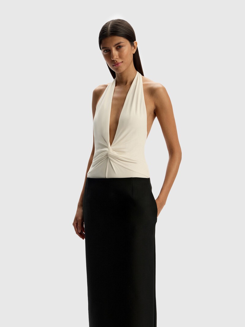 Боди с глубоким V-вырезом и полуоткрытой спиной — для особенных вечеров. Оно мягко прилегает к телу, а узел на уровне талии создает пластичные складки, задающие динамику всему образу. Для большего комфорта мы добавили подкладку и эластичную тесьму по краям. Сделано в Китае.