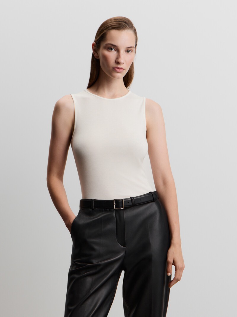 Трикотажная майка с комфортными широкими бретелями и универсальной длиной пополнит ваш список любимых вещей в этом сезоне. Она сшита из приятной на ощупь смеси вискозы и шерсти и имеет тонкие деликатные швы, благодаря чему отлично подходит для многослойных образов. Сделано в Китае.