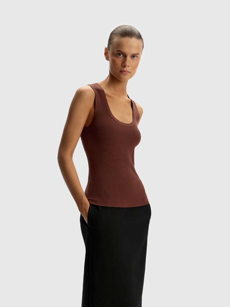 Трикотажная майка прилегающего силуэта — незаменимая в базовом гардеробе. Связана из гладкой, нежной и легкой пряжи с еле заметным блеском, благодаря которому не выглядит буднично. Круглый вырез и закрытая спинка позволяют носить майку как топ в сочетании с жакетами или делать частью вечерних образов. У этого изделия низкая пиллингуемость. При правильном уходе первые пилли могут появиться на нем в среднем через 10 носок. Сделано в Китае.