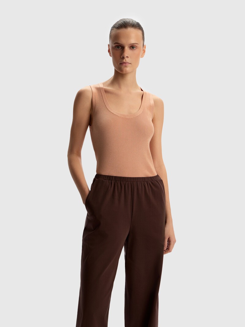 Трикотажная майка прилегающего силуэта — незаменимая в базовом гардеробе. Связана из гладкой, нежной и легкой пряжи с еле заметным блеском, благодаря которому не выглядит буднично. Круглый вырез и закрытая спинка позволяют носить майку как топ в сочетании с жакетами или делать частью вечерних образов. У этого изделия низкая пиллингуемость. При правильном уходе первые пилли могут появиться на нем в среднем через 10 носок.