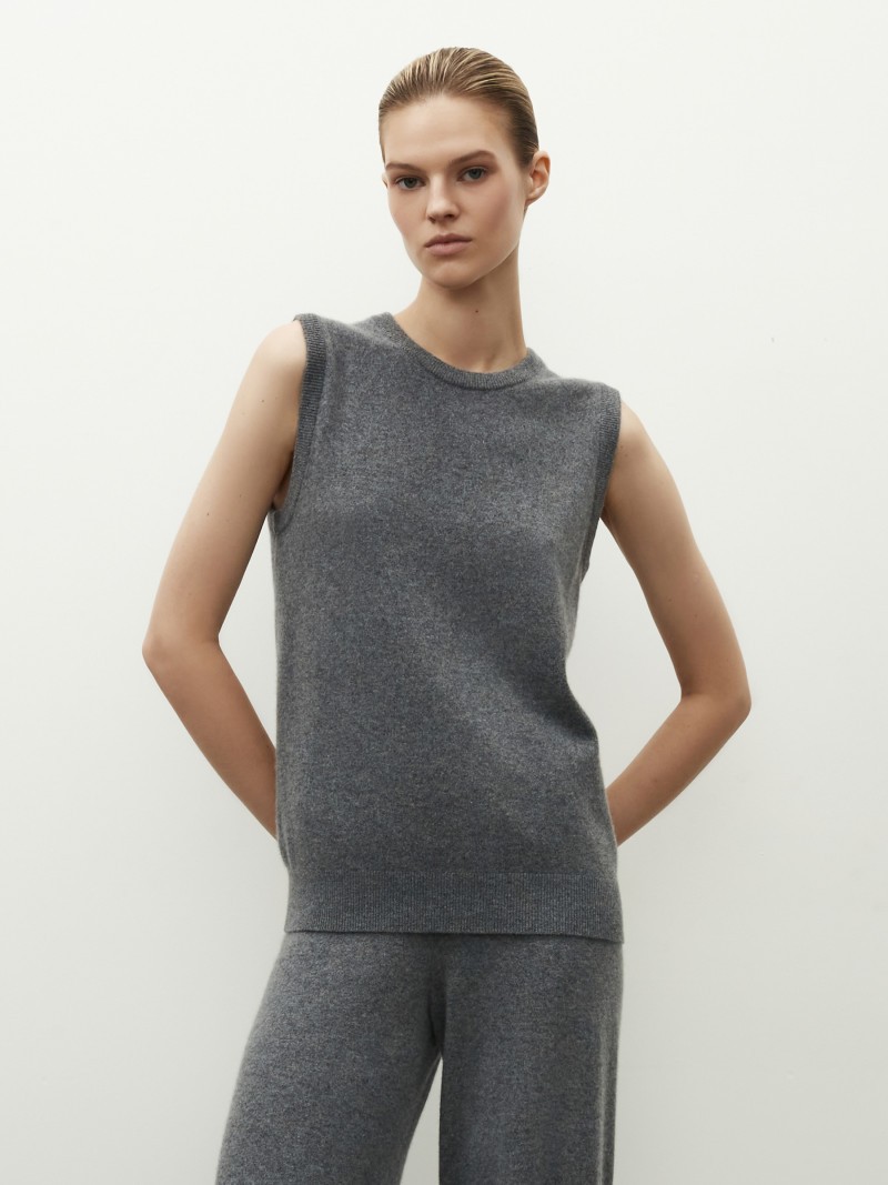 Аккуратный топ из невесомого кашемира пригодится не раз: его можно носить как жилет, сделать частью повседневного брючного костюма или стилизовать для вечера. Универсальная и комфортная модель связана из тонкой, пушистой нити и не просвечивает. У этого изделия средняя пиллингуемость. При правильном уходе первые пилли могут появиться на нем спустя 4-7 носок. При необходимости удаляйте пилли специальной машинкой. Сделано в Китае.