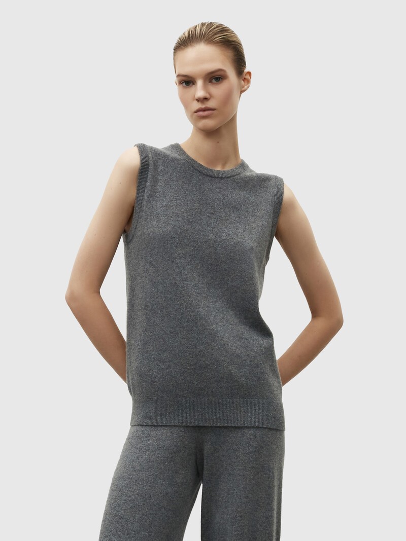Аккуратный топ из невесомого кашемира пригодится не раз: его можно носить как жилет, сделать частью повседневного брючного костюма или стилизовать для вечера. Универсальная и комфортная модель связана из тонкой, пушистой нити и не просвечивает. У этого изделия средняя пиллингуемость. При правильном уходе первые пилли могут появиться на нем спустя 4-7 носок. При необходимости удаляйте пилли специальной машинкой.