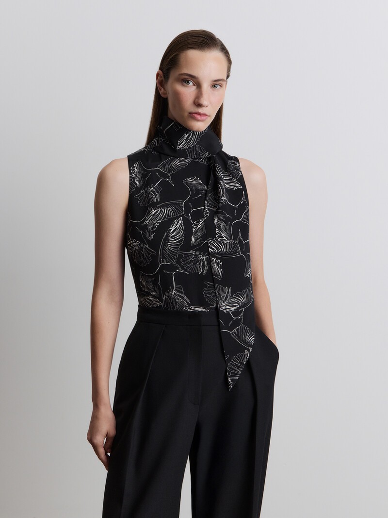 Топ из натурального шелка с изящным рисунком в виде парящих птиц. Эскиз был создан французским художником вручную, что придало принту выразительность и глубину. Широкий шарф, пришитый под воротником, можно стилизовать по-разному: набросить на плечи или завязать бант. Мы выбрали для изделия плотный тутовый шелк — он обволакивает силуэт и особенно красиво смотрится в образах с мягкими и фактурными материалами наших пальто и трикотажа. 100% Mulberry шелк — самый ценный вид шелковых волокон. Сотканный из тончайших нитей, этот матовый материал отличается особой прочностью. Сделано в России.