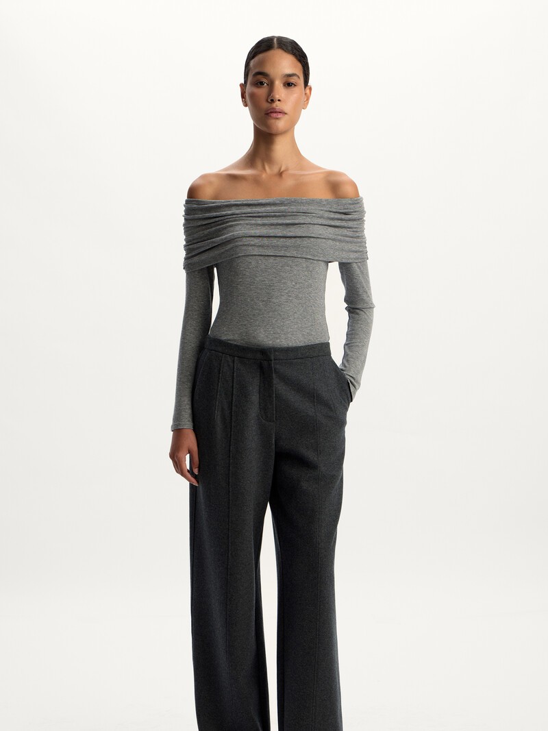 Топ с открытыми плечами: прилегающий силуэт, длинный узкий рукав и широкая драпированная деталь с эластичным верхним краем для комфортной посадки. Выполнен из мягкого трикотажа на основе вискозы, дышащего и сохраняющего тепло благодаря небольшому количеству шерсти в составе. Рекомендуем выбирать белье в тон — пластичный материал может слегка просвечивать. Сделано в Китае.