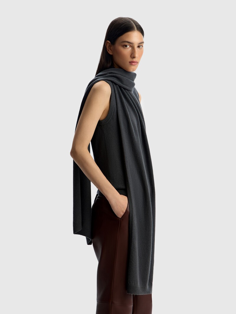 Этот базовый прямой топ без рукавов, дополненный эффектной деталью-шарфом, получился тонким и теплым. Его можно носить по-разному, сочетая с контрастной одеждой или включив в монохромный образ. У этого изделия средняя пиллингуемость. При правильном уходе первые пилли могут появиться на нем спустя 4-7 носок. Для удаления пиллей пользуйтесь специальной машинкой. Сделано в Китае.