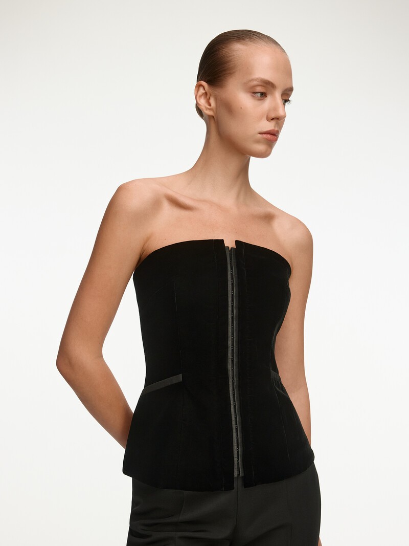 1. Бархат для этого топа создан в Японии на фабрике Agehara Velvet, которая производит ткани для Armani, Comme Des Garcons и Prada 2. В основе материала — вискоза и купро, поэтому он мягкий, дышащий и пластичный 3. Прорезной бархат — долговечный: ворс не осыпется и не отклеится после химчисток. Ткань дает глубокие переливы цвета и выразительный блеск в складках 4. Подкладка из хлопка делает топ плотнее, а внутренние кости создают эффект корсета. Удобно надевать благодаря застежке на крючки спереди 5. Отделка из дикого шелка контрастирует с бархатом и подчеркивает его глубину Чтобы правильно подобрать размер и посадку, рекомендуем примерить топ в магазине