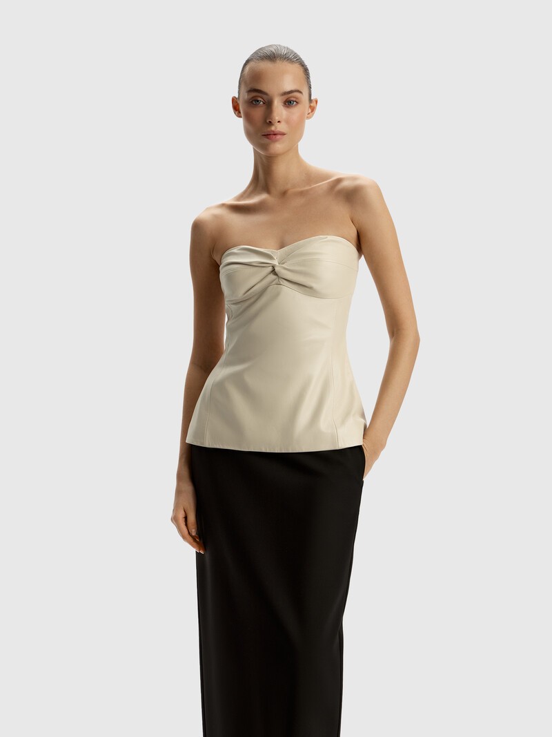 Кожаный топ-корсет с декоративным узлом на груди подчеркивает талию, повторяя мягкие линии женственного силуэта. Для лучшего прилегания по верхнему краю проложена силиконовая тесьма. Материал — тонкая и пластичная кожа ягненка кремового оттенка с легким перламутровым эффектом. Застегивается на молнию и крючок. На эластичной подкладке. Золотой статус LWG означает, что фабрика полностью отвечает требованиям к экологической безопасности процессов и химикатов, имеет все необходимые очистные сооружения и заботится о здоровье сотрудников.