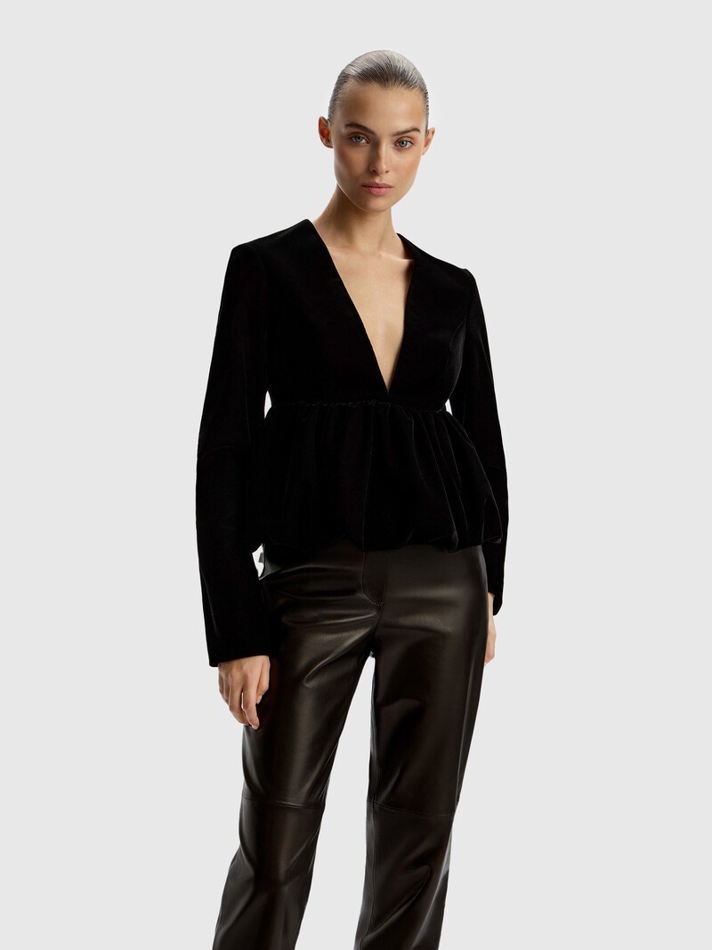 Черный бархатный топ с пышной драпированной баской и глубоким V-вырезом визуально вытягивает силуэт. Для этой модели мы выбрали приятный дышащий материал с густым ровным ворсом — достаточно плотный, на трикотажной основе. Внутри — мягкая сетка, которая хорошо держит форму и создает объем. Сочетайте с джинсами, брюками, узкими длинными юбками и лаконичными мини. На подкладке.