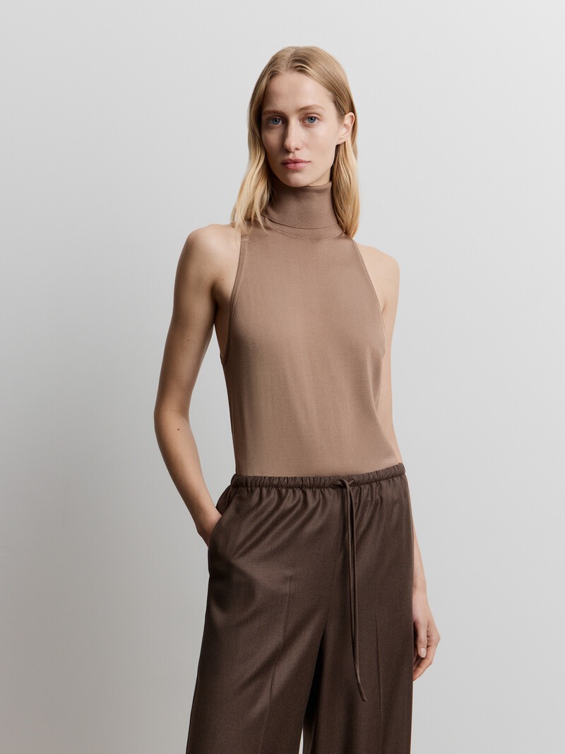 Топ из шелка с воротником халтер — незаменимый в те дни, когда солнца становится меньше, но об осени думать пока не хочется. Связанный мелкими петельками в одну нить, он придаст образу хрупкость и легко впишется в гардероб благодаря своей мягкости и деликатному блеску. Пожалуйста, обращайтесь с топом бережно: острые предметы и аксессуары могут оставить на тонком трикотаже зацепки или повредить нить. У этого изделия низкая пиллингуемость. При правильном уходе первые пилли могут появиться на нем в среднем через 10 носок. Сделано в Китае.
