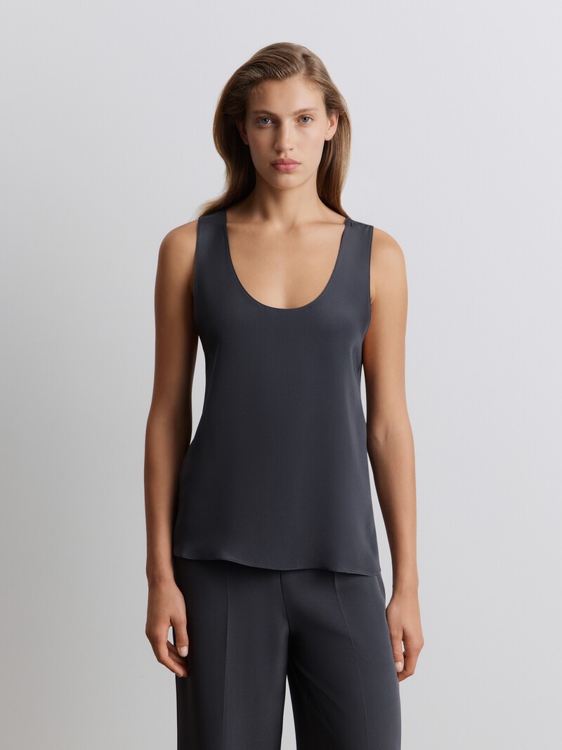 Прямой лаконичный топ из плотного шелка комфортно облегает силуэт — его можно носить самостоятельно или в составе многослойных образов. Выполнен из тутового шелка высшего качества: туго перекрученные тончайшие нити придают материалу особую долговечность. 100% Mulberry шелк — самый ценный вид шелковых волокон. Сотканный из тончайших нитей, этот матовый материал отличается особой прочностью. Сделано в России.