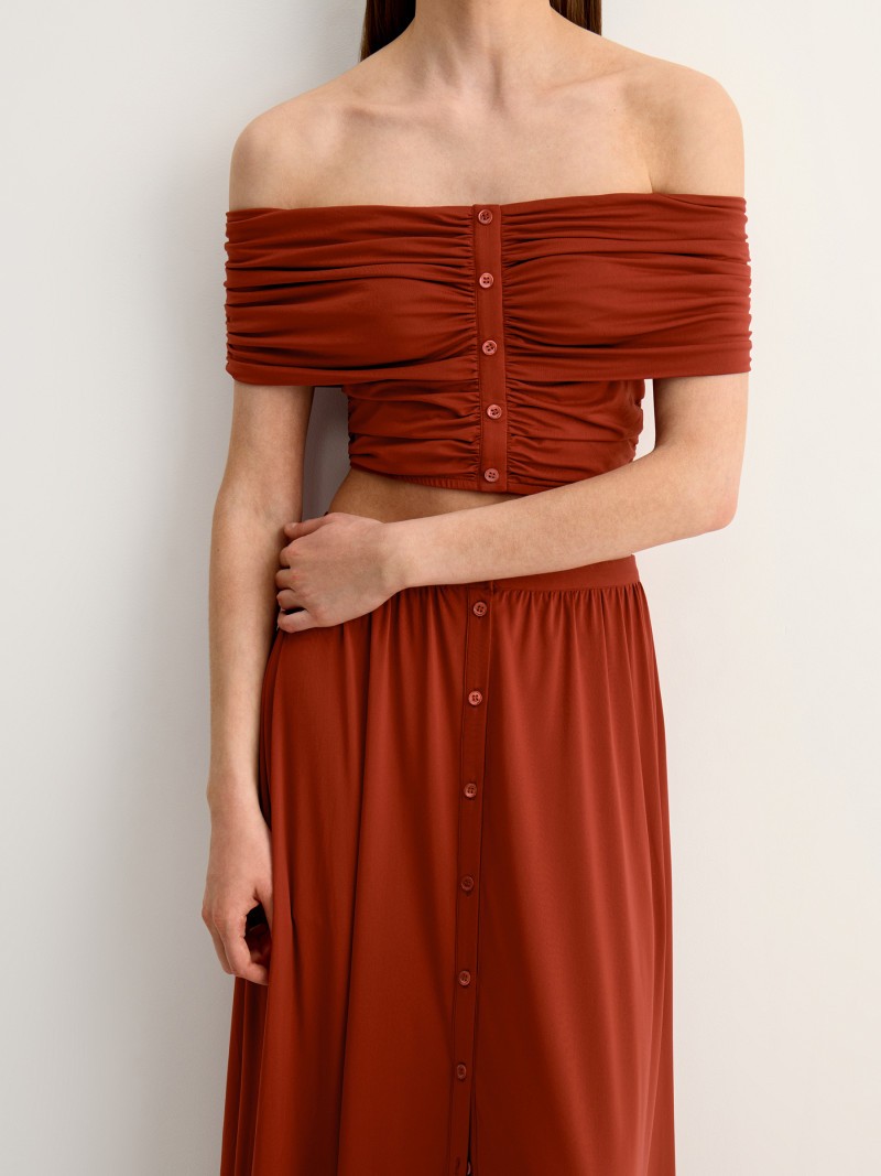 Это изделие из капсулы Hearts & Storeez, созданной совместно с Фондом «Обнаженные сердца». 10% от продаж этих изделий в России будут направлены на поддержку программ Фонда. Этот драпированный кроп-топ с открытыми плечами скроен как вечерний, но намного комфортнее благодаря эластичности ткани — легкой, текучей, гладкой и деликатно поблескивающей в складках. Силиконовая тесьма по спинке обеспечивает лучшее прилегание. Комбинируйте с юбкой из нашей коллекции. Деликатный материал требует бережного обращения: аксессуары могут оставить затяжки или повредить нить. Сделано в Китае.