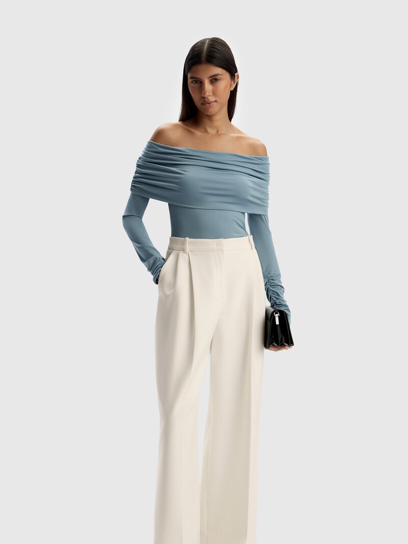 Удлиненный топ с открытыми плечами и акцентом на линии ключиц — для подчеркнуто хрупких женственных образов. Тонкий эластичный трикотаж повторяет контуры тела и чуть поблескивает в складках. Для большего комфорта мы сделали отворот двухслойным, а по краям добавили эластичную тесьму. Деликатный материал требует бережного обращения: аксессуары могут оставить затяжки или повредить нить. Сделано в Китае.