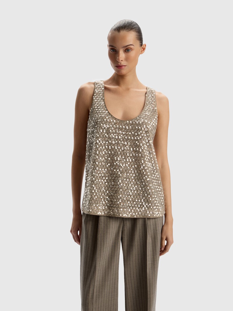 Акцентный топ с декором из серебристых пайеток и бисера. Для модели выбрали тонкую мягкую сетку, расшитую круглыми пайетками, сложенными, как лепестки цветов — они сияют и переливаются, когда вы двигаетесь. Чтобы декор не покалывал кожу, мы обработали края кантом из вискозы и шелка и добавили подкладку. Сделано в Китае.