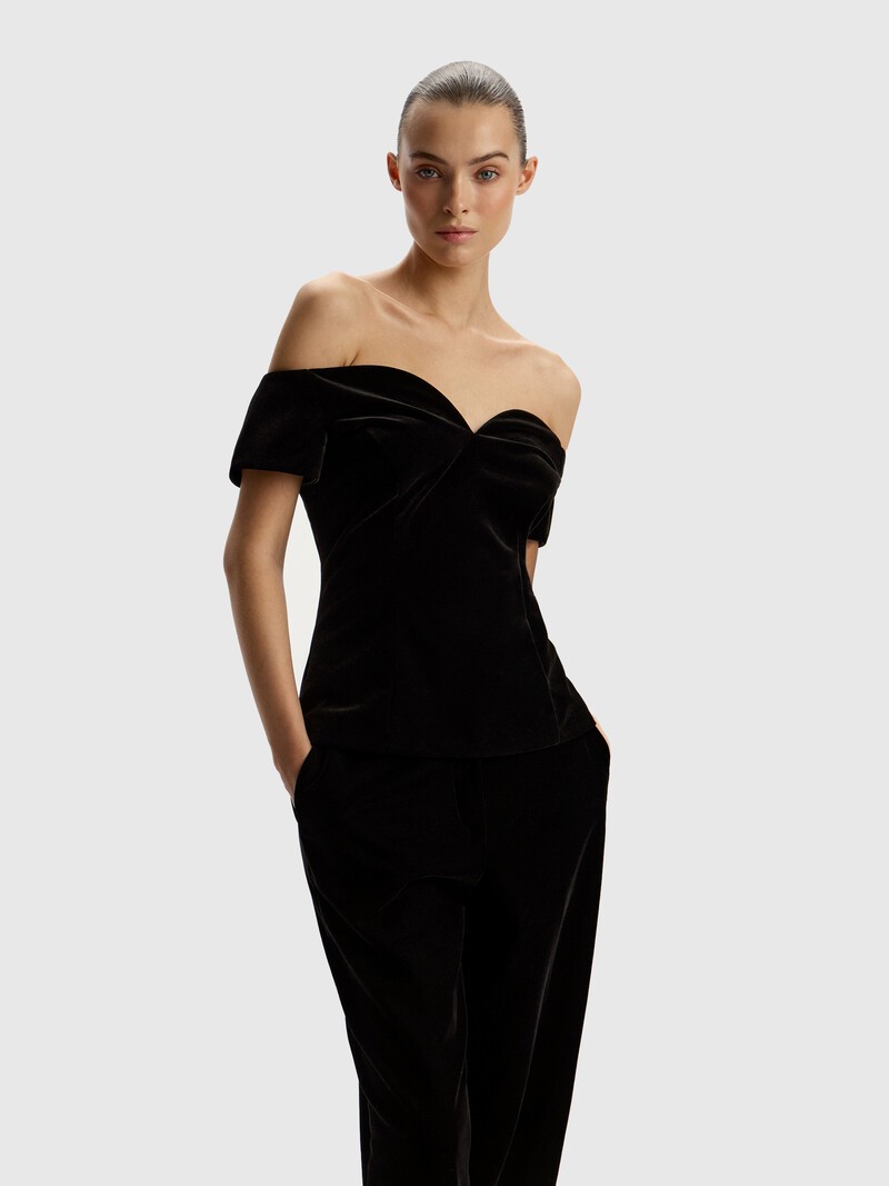 Бархатный топ с открытыми плечами и фигурной линией декольте. Носите его с кожей, денимом, вечерними брюками или юбкой — он будет сидеть безупречно благодаря выверенному крою и скрытой молнии на спине. Выполнен из плотного бархата с густым и мягким ворсом, который меняет свое направление, когда проводишь по нему рукой. А сделать это точно захочется.