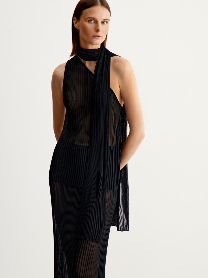 Топ из нашего комплекта с юбкой — тонкий и полупрозрачный, почти неощутимый на теле. Он приятно облегает силуэт и создает эффект открытой спины благодаря асимметричной линии выреза. А чтобы подчеркнуть легкость модели, мы сделали съемный длинный шарф — его можно зафиксировать с помощью петельки на плече, оставить свободным или обернуть вокруг шеи. Сделано в Китае.