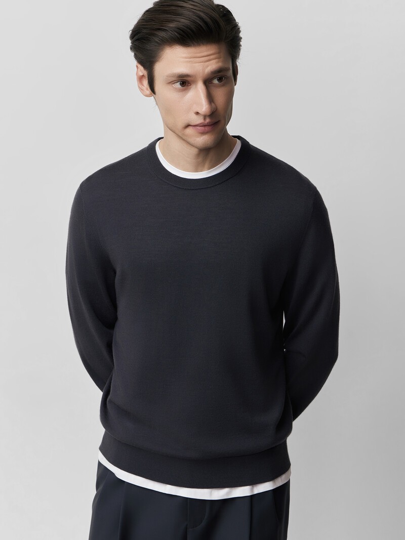 Уютный базовый джемпер — свободный, достаточно тонкий, с чуть спущенной линией плеча и аккуратным круглым вырезом. Связан гладью из мягкой и легкой мериносовой шерсти с добавлением шелка, придающего трикотажу деликатный естественный блеск. В таком не будет слишком жарко, а благодаря классической длине свитер можно носить и с джинсами, и со строгими брюками. У этого изделия низкая пиллингуемость. При правильном уходе первые пилли могут появиться на нем в среднем через 10 носок. Сделано в Китае.