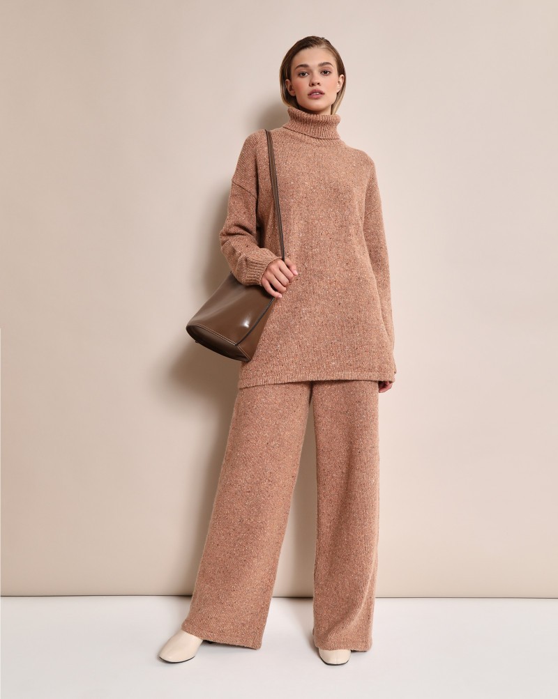 Широкие вязаные брюки. Посадка на талии, эластичный пояс. Без карманов и застежки. Брюки связаны крупными петлями из объемной мягкой и теплой шерсти. В составе пряжи три вида нитей: мериносовая шерсть – эластичная, гладкая и легкая нить, очень мягкая на ощупь и приятная к коже; шерсть альпаки, которая высоко ценится за ее прочность и греющие свойства; а также нейлон, который делает пряжу легче и эластичнее, помогает изделию сохранять свою форму и не растягиваться. Брюки можно дополнить любым объемным джемпером, водолазкой или свитером. Сделано в Китае.
