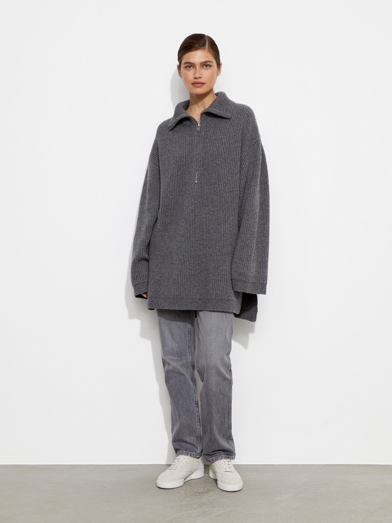 Свитер из кашемира и шерсти. Уютный свитер для модных и расслабленных образов: широкий воротник можно застегнуть или разложить по плечам, а объемные и нарочито длинные рукава — подвернуть на нужную высоту. Мы выполнили свитер в размере one size из теплой шерсти мериноса и пушистого кашемира, которые вместе создают рельефную и нежную к коже фактуру. Сделано в Китае.