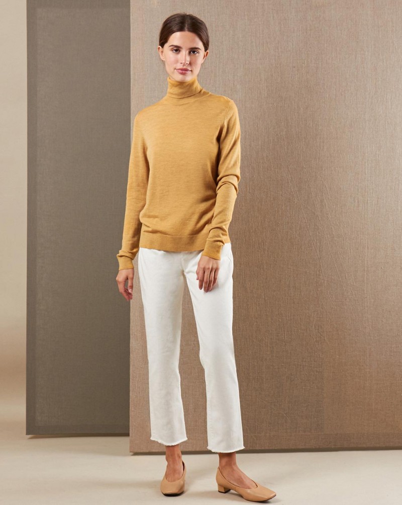 Свитер из тонкой шерсти. Базовый свитер прямого силуэта с высоким воротником и длинными рукавами. Выполнен из тонкой мериносовой шерсти ultrafine. Это легкая, мягкая, прочная и упругая пряжа, отмеченная международным знаком качества Woolmark. Вы можете сочетать свитер с джинсами, юбками-трапециями и брюками в деловом стиле. Сделано в Китае.