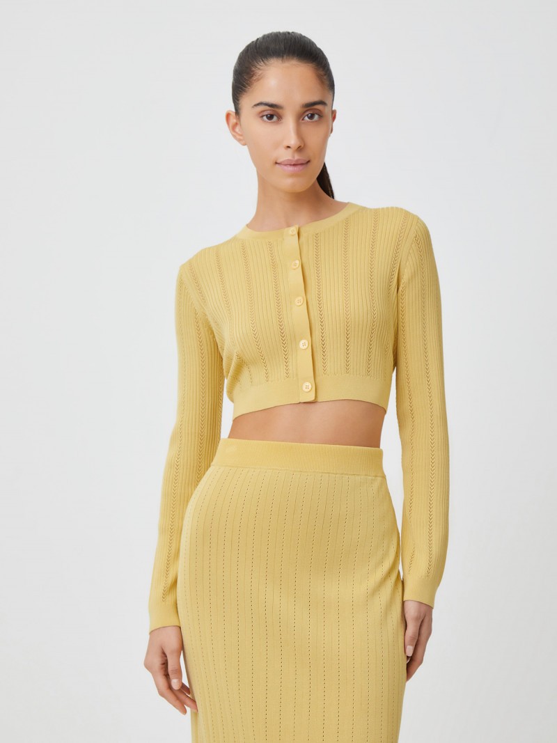 Укороченный кардиган с ажурным рисунком и перламутровыми пуговицами для изящных летних образов с топами и платьями. Тонкий и эластичный трикотаж из мягкого искусственного шелка облегает силуэт, не добавляя лишний объем, и слегка холодит кожу благодаря волокнам лиоцелла в составе. Сделано в Китае.