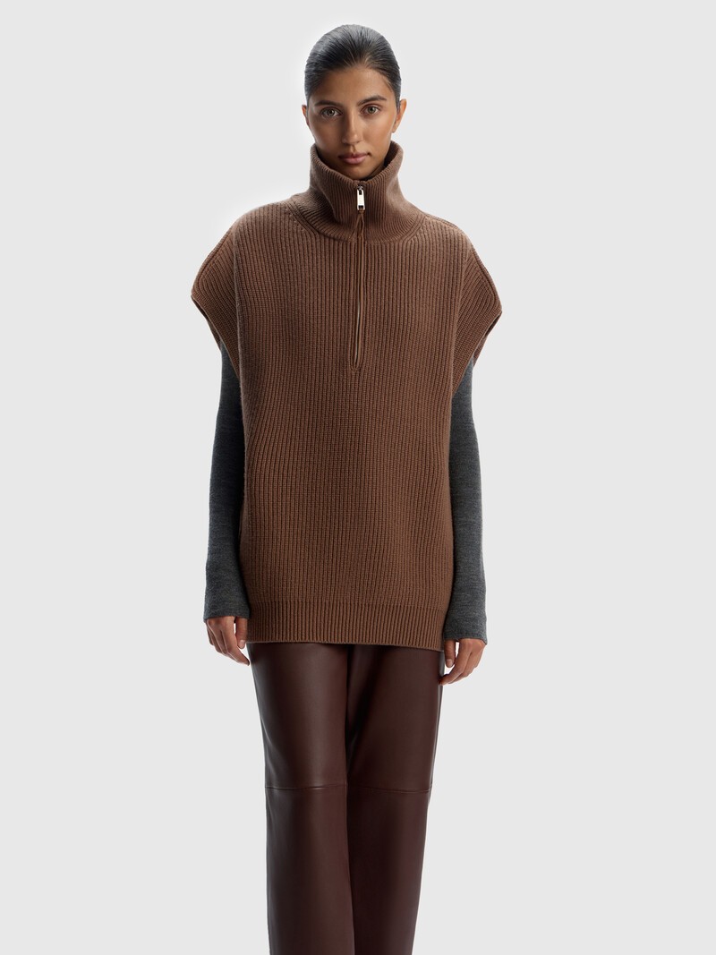 Вязаный жилет с высоким воротником и широкими проймами можно носить как верхнюю одежду — на толстовки и джемперы, или под пальто, чтобы было теплее. Мягкая мериносовая шерсть связана объемными плотными петлями, а просторный силуэт и неплотные резинки облегчают процесс надевания и снимания. Акцентная деталь – молния с отделкой натуральной кожей на воротнике, который в любой момент можно превратить из стойки в отложной. У этого изделия средняя пиллингуемость. При правильном уходе первые пилли могут появиться на нем спустя 4-7 носок. При трении о шершавые поверхности могут образовываться пилли — справиться с ними поможет машинка по уходу за трикотажем. Сделано в Китае.