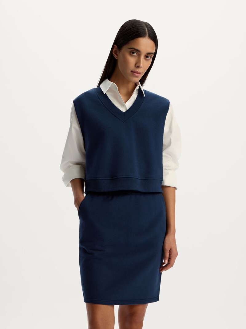 Свободный жилет из плотного мягкого футера — чуть укороченный, с широкими проймами. Его можно носить не только вместе с рубашкой, но и как первый слой: приятная к телу ткань пластична и хорошо держит форму благодаря добавлению искусственных волокон. Сочетайте с юбкой из нашей коллекции для создания комфортного повседневного образа. Сделано в Китае.