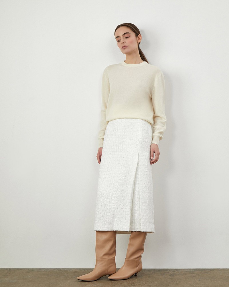 Юбка миди из твида. Завышенная талия, имитация разрез сбоку.Застежка сзади на потайную молнию. Высокий разрез придает образу пикантность и позволяет свободно двигаться при ходьбе. Вы можете сыграть на контрасте фактур и сочетать юбку с легкими блузами, топами или трикотажными джемперами. При неаккуратном использовании на ткани со сложным переплетением длинных нитей могут появиться затяжки, которые легко устраняются самостоятельно (заправив выдернутую нить во внутрь). Сделано в России.