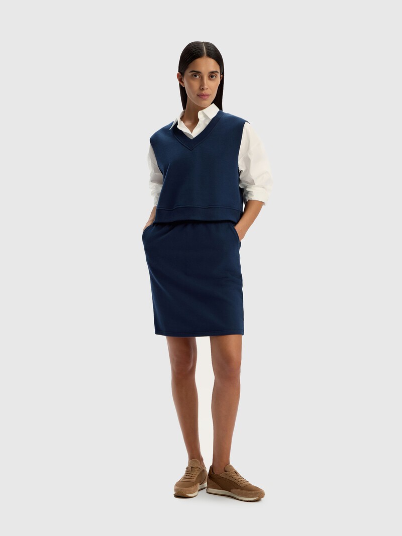 Прямая юбка из плотного мягкого футера — длиной чуть выше колена, с карманами по бокам. Внутрь эластичного пояса продет плоский хлопковый шнурок, который позволит отрегулировать посадку. Приятный на ощупь и легкий хлопковый материал хорошо держит форму, а добавление искусственных волокон делает его более практичным в уходе. Сочетайте с жилетом из нашей коллекции.