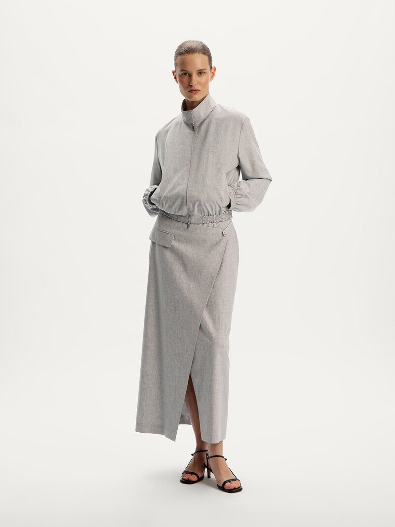 Прямая асимметричная юбка с имитацией запаха — лаконичная и комфортная благодаря заниженной посадке. Ее глубокий разрез красиво распахивается в движении. Одну из деталей мы сделали более длинной, а верх удобно фиксировать с помощью хлястика. Выполнена из тонкой и гладкой ткани от нашего португальского поставщика: материал с меланжевым рисунком и деликатным блеском сочетает плюсы искусственных и натуральных волокон — он приятный на ощупь и долговечный. На подкладке. Застегивается на молнию. Сделано в Турции.