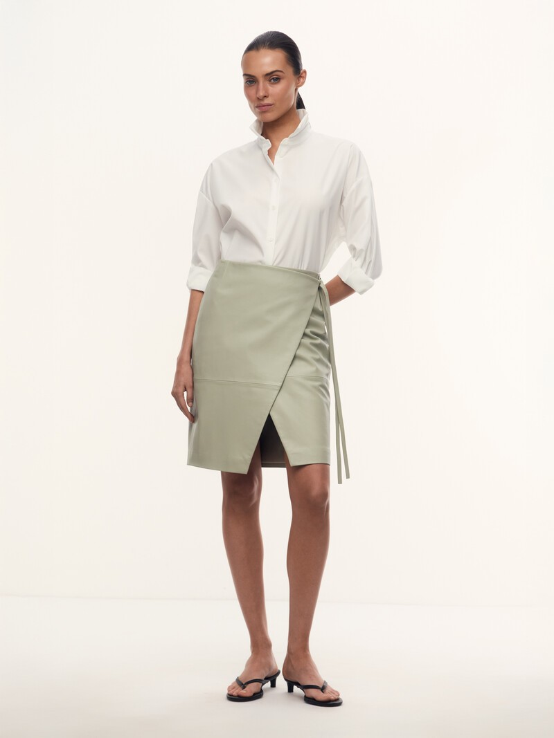 1. Для этой модели мы выбрали мягкую и пластичную кожу ягненка полурастительного дубления — она годами сохраняет природную прочность 2. Все плюсы запаха: слегка распахивается, когда вы двигаетесь, красиво приоткрывая ноги 3. Для вашего комфорта добавили подкладку из шелковистой поливискозы 4. Поставщик, с которым мы сотрудничаем, имеет наивысшую оценку организации по защите окружающей среды LWG — золотой сертификат. Это значит, что фабрика полностью соответствует требованиям экологической безопасности, имеет все необходимые очистные сооружения и заботится о здоровье сотрудников
