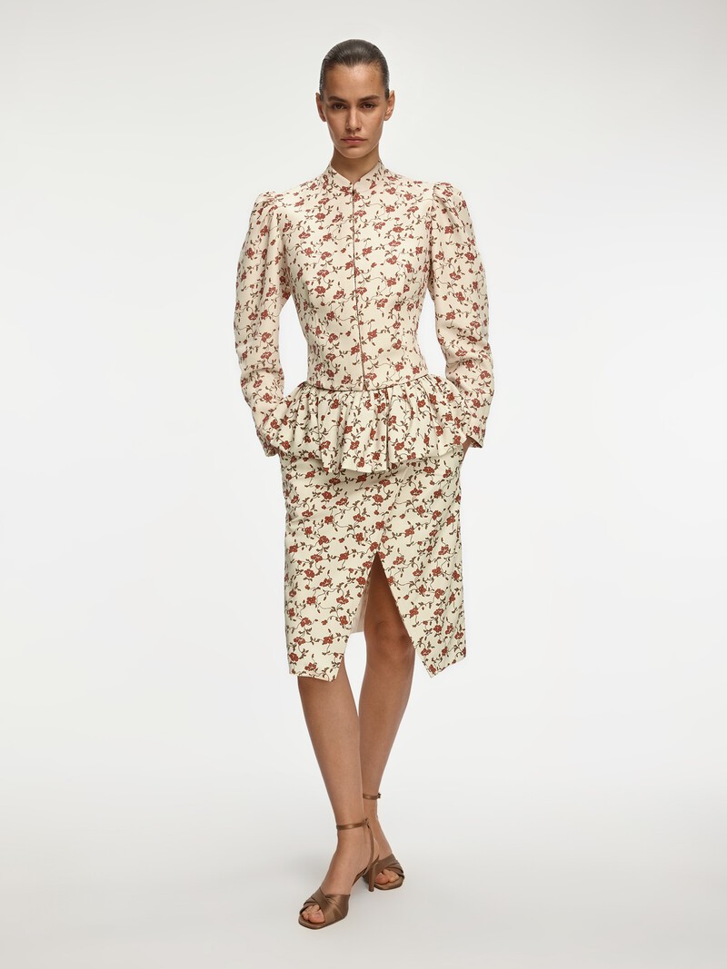 1. Тафта с 12% шелка — плотная, мягкая, слегка хрустящая ткань с матовым блеском 2. Чтобы добиться плавных, акварельных переходов цвета, мы отказались от цифровой печати и работали в технике шелкографии 3. Можно носить двумя способами: баска легко крепится с помощью мини-кнопок 4. Чтобы вам было комфортно, мы сделали карманы и подкладку из тончайшей вискозы с шелком Тафта мнется, и в складках ее блеск становится еще выразительнее. Чтобы разгладить ткань, используйте утюг (не отпариватель)