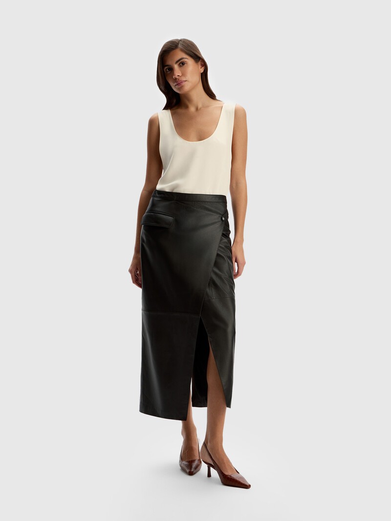 Юбка из мягкой и пластичной кожи. Посадка слегка занижена, верхняя деталь фиксируется у пояса кнопкой — когда вы быстро идете или сидите, юбка распахивается, открывая ноги. Натуральная кожа ягненка проходит тщательный отбор и бережную обработку, поэтому сохраняет природную прочность и долговечность. Подкладку мы сделали эластичной, а застежку — на потайную молнию сзади. Золотой статус LWG означает, что фабрика полностью отвечает требованиям к экологической безопасности процессов и химикатов, имеет все необходимые очистные сооружения и заботится о здоровье сотрудников. Сделано в Турции.