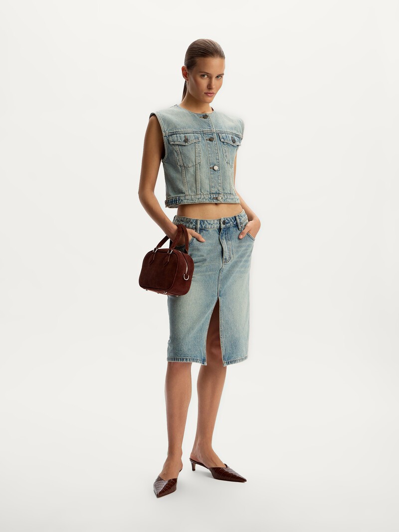 Юбка с патчем из натуральной кожи — универсальная и удобная. Длина до колена, низкая посадка и шлица спереди позволят стилизовать ее для более строгих офисных образов или сочетать со спортивными вещами. Выполнена из денима плотностью 13,5 Oz с выраженным рубчиком. Со временем такой материал красиво изнашивается, а зеленоватый тинт уже сегодня придает юбке легкий винтажный характер. Застегивается на молнию и болт. Сделано в Китае.