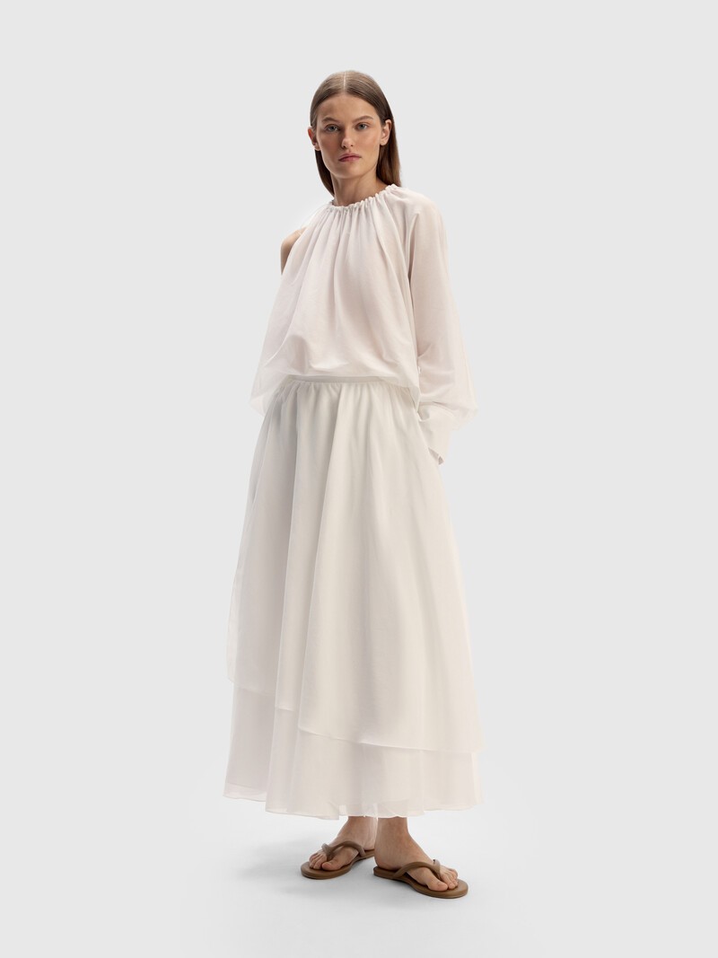 Многослойная юбка из полупрозрачной ткани — для летних расслабленных образов. Такую можно носить с пышной блузкой или майкой из нашей коллекции, а на пляже — с купальником. Запашная деталь делает юбку еще более воздушной, а невесомая ткань из хлопка и шелка чуть поблескивает на солнце и отлично дышит. Сделано в России.