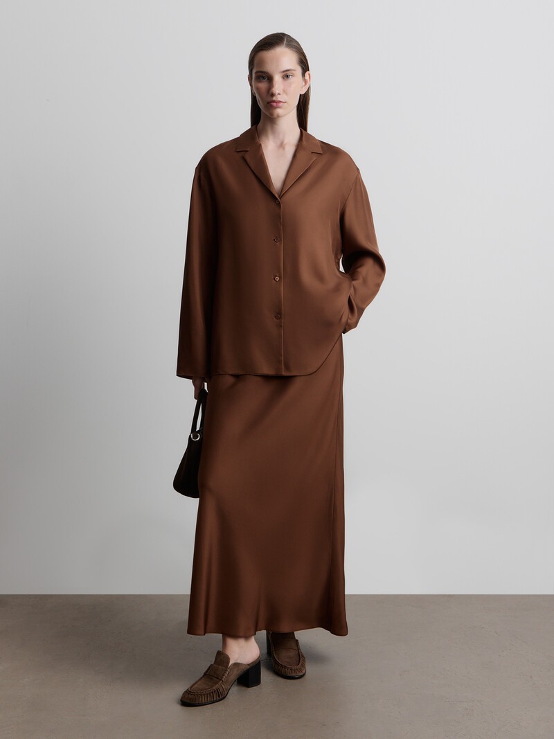 Лаконичная юбка макси с посадкой на талии скроена по косой — она мягко очерчивает бедра, а силуэт напоминает русалочий хвост. Тонкий, пластичный и плотный матовый шелк с твиловым переплетением хорошо держит форму и сочетается с другими фактурами — трикотажем, шифоном, шелком и кожей. 100% Mulberry шелк — самый ценный вид шелковых волокон. Сотканный из тончайших нитей, этот матовый материал отличается особой прочностью. Сделано в Китае.
