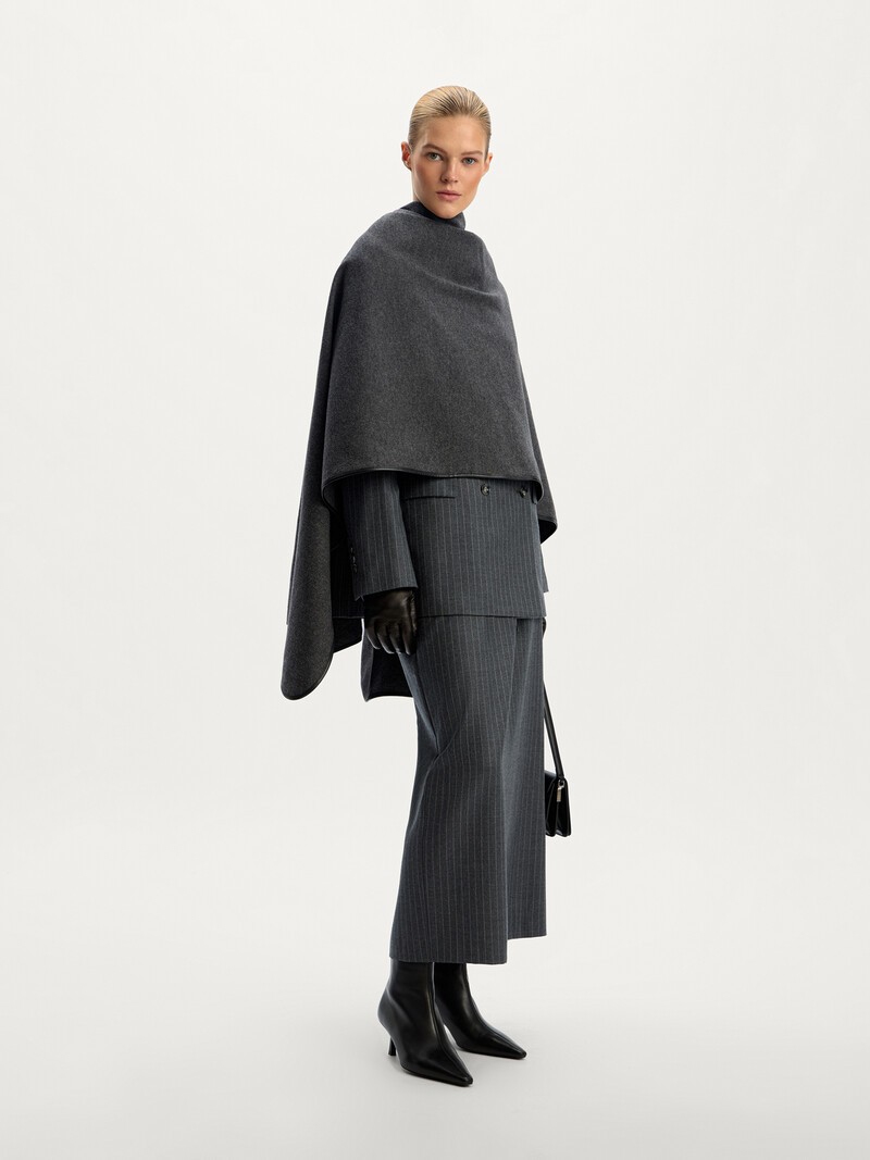 Свободная длинная юбка из легкой шерсти в полоску, с высоким вырезом сзади и карманами по бокам. Для более комфортной посадки узкий эластичный пояс можно отрегулировать с помощью шнурка. Пластичная, ровная, чуть ворсистая ткань с твиловым переплетением произведена на фабрике в Турции. На подкладке из тонкой поливискозы. Сочетайте с жакетом из нашей коллекции. Сделано в России.