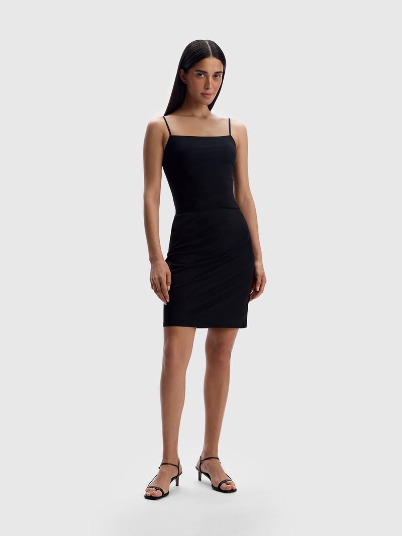 Невесомая лаконичная юбка — для теплых дней и многослойных образов. Тонкий и гладкий трикотаж хорошо тянется, повторяет контуры тела и чуть поблескивает на солнце. Рекомендуем носить юбку с бесшовным бельем. Эластичная ткань склонна к образованию зацепок. Надевайте юбку осторожно, а если нить вытянулась, аккуратно подтяните ее с изнанки. Сделано в Китае.